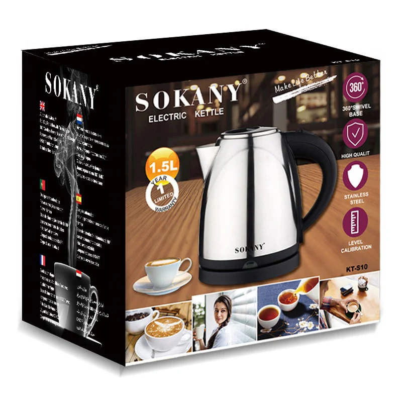 Электрический чайник Sokany KT-S10 — это высокоэффективный прибор мощностью 2000 Вт, изготовленный из высококачественной нержавеющей стали. Его объем 1,5 литра, вращающаяся на 360° подставка и функция автоматического отключения делают его идеальным для повседневного использования. Он оснащен системой защиты от перегрева и огнестойкой ручкой для максимальной безопасности.