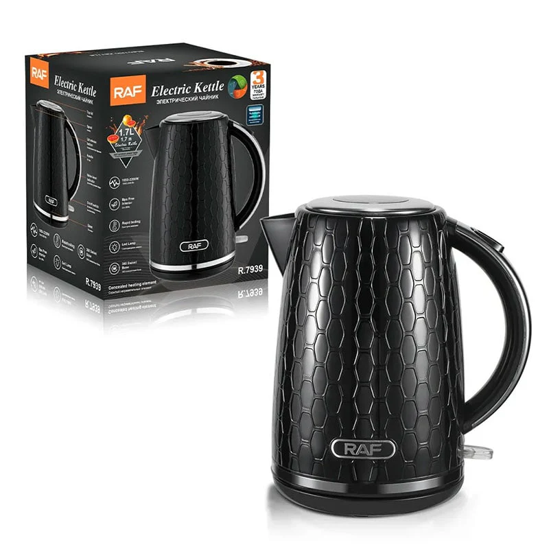 RAF R.7939 — 2200 W სიმძლავრის მქონე ელექტრო ჩაიდანი 1.7 ლ მოცულობით. აღჭურვილია უჟანგავი ფოლადის გამაცხელებელი ფირფიტით, 360° მბრუნავი სადგამითა და ორმაგი დაცვის სისტემით (ავტომატური გათიშვა და დაცვა ცარიელ მდგომარეობაში ჩართვისგან). საიმედო და სწრაფი მოწყობილობა თქვენი სამზარეულოსთვის.
