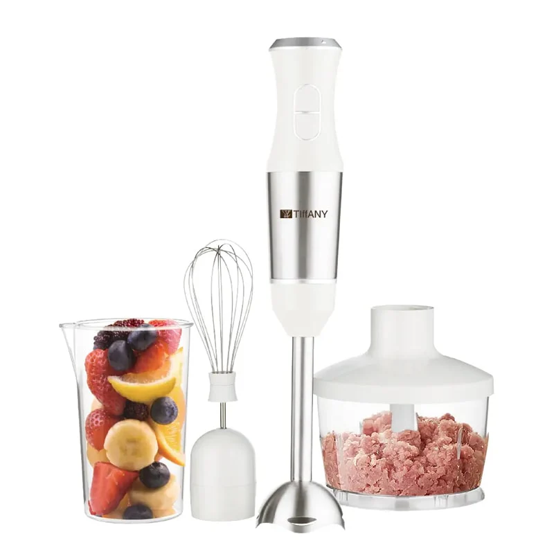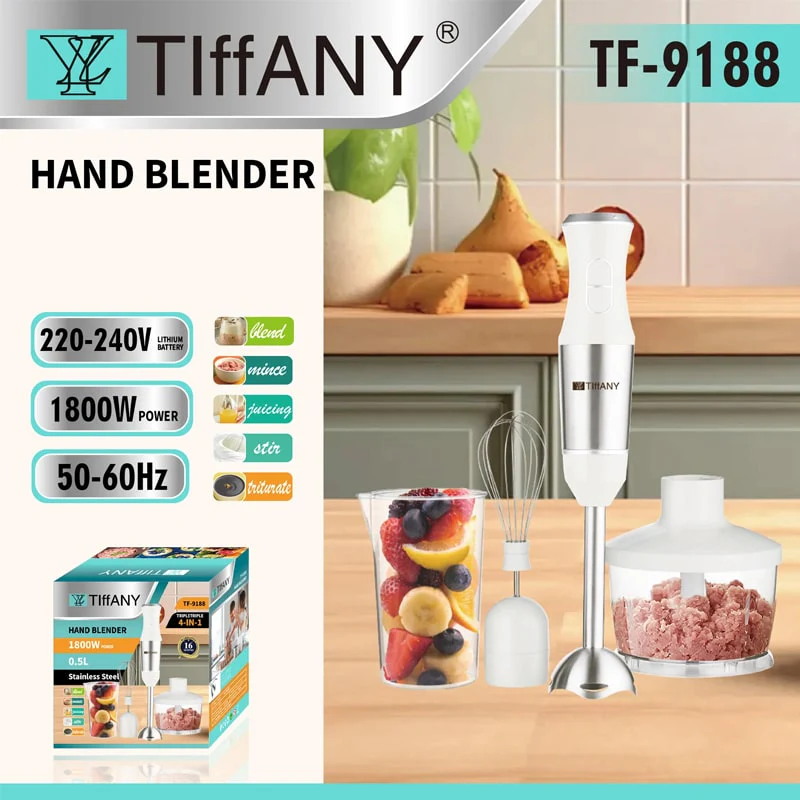 მულტიფუნქციური ბლენდერი TIFFANY TF-9188 — 1800 W სიმძლავრის მულტიფუნქციური ხელის ბლენდერი, რომელიც აერთიანებს ბლენდერს, ჩოფერს (700 მლ) და მიქსერს (სადღვები). აღჭურვილია უჟანგავი ფოლადის დანებით, 500 მლ-იანი საზომი ჭიქითა და გადახურებისგან დაცვის ფუნქციით. იდეალურია დაქუცმაცების, თქვეფისა და შერევისთვის.