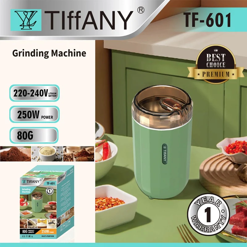 Tiffany TF-601 — 250 W სიმძლავრის მქონე მრავალფუნქციური საფქვავი 80 გ მოცულობის რეზერვუარით. აღჭურვილია უჟანგავი ფოლადის დანის პირებითა და გამძლე კორპუსით. გამოირჩევა დახვეწილი მწვანე დიზაინითა და გამოყენების სიმარტივით. იდეალურია ყავის, სუნელებისა და სხვა მშრალი პროდუქტების სწრაფი დაფქვისთვის.