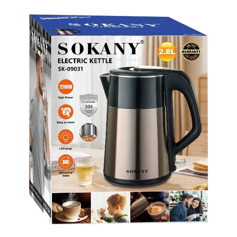 Sokany SK-09031 არის დიდი მოცულობის (2.8L) ელექტრო ჩაიდანი, რომელიც დამზადებულია პრემიუმ ხარისხის უჟანგავი ფოლადისგან. 2200W სიმძლავრე უზრუნველყოფს წყლის სწრაფ დუღილს, ხოლო მეტალის კორპუსი ინარჩუნებს წყლის სისუფთავეს და ბუნებრივ გემოს. იდეალურია დიდი ოჯახებისთვის და სამზარეულოსთვის, სადაც ხარისხი და სისწრაფე პრიორიტეტია.